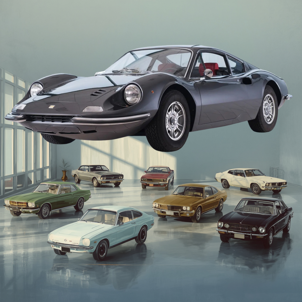 Le linee fluide, il profilo basso e la cura dei dettagli fecero di questa vettura un punto di riferimento per il design automobilistico italiano, segnando un capitolo fondamentale nella storia della Dino e anticipando l’evoluzione delle sportive Ferrari successive.
