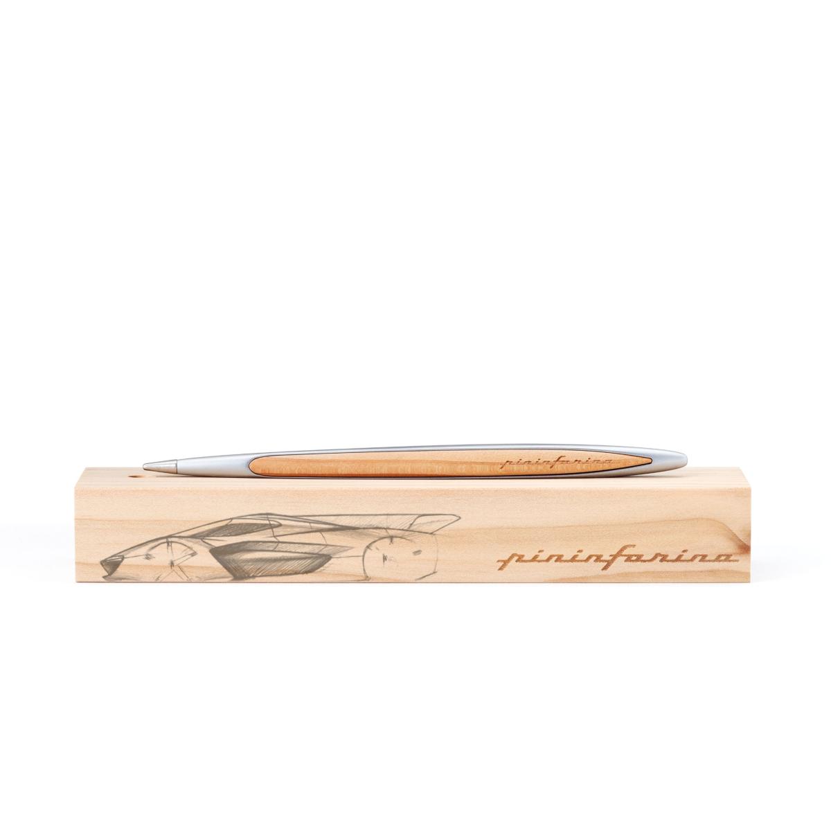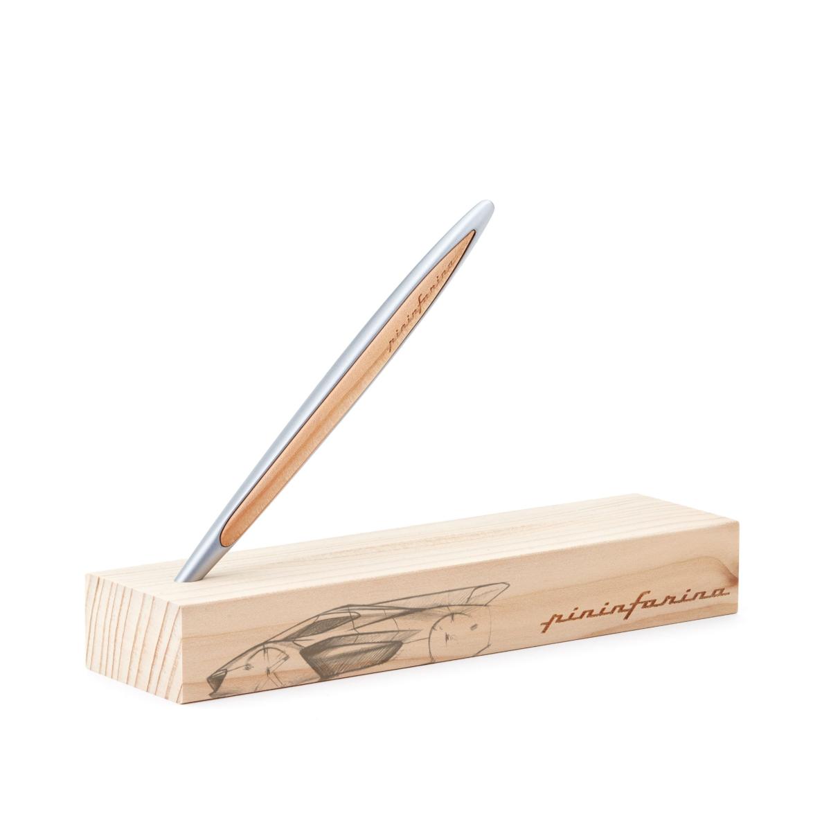 La scocca in alluminio, ramata e trattata galvanicamente, dialoga con la naturalezza del legno di cedro, creando un contrasto sofisticato tra superfici tecniche e materiali organici. Il supporto da scrivania in legno massello trasforma la penna in un vero elemento di design, pensato anche per essere esposto.