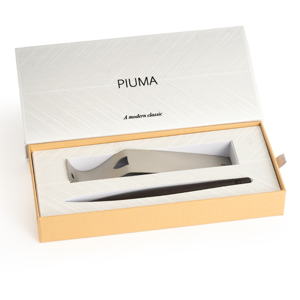 La Forever Piuma Ethergraf® A modern Classic è uno strumento da scrittura unico e suggestivo, interamente realizzato in legno massello di acero con un design che ricorda la leggendaria penna d’oca, simbolo degli studi di Leonardo da Vinci sul volo. L’elegante basamento in acciaio satinato permette allo stilo di rimanere perfettamente in equilibrio.