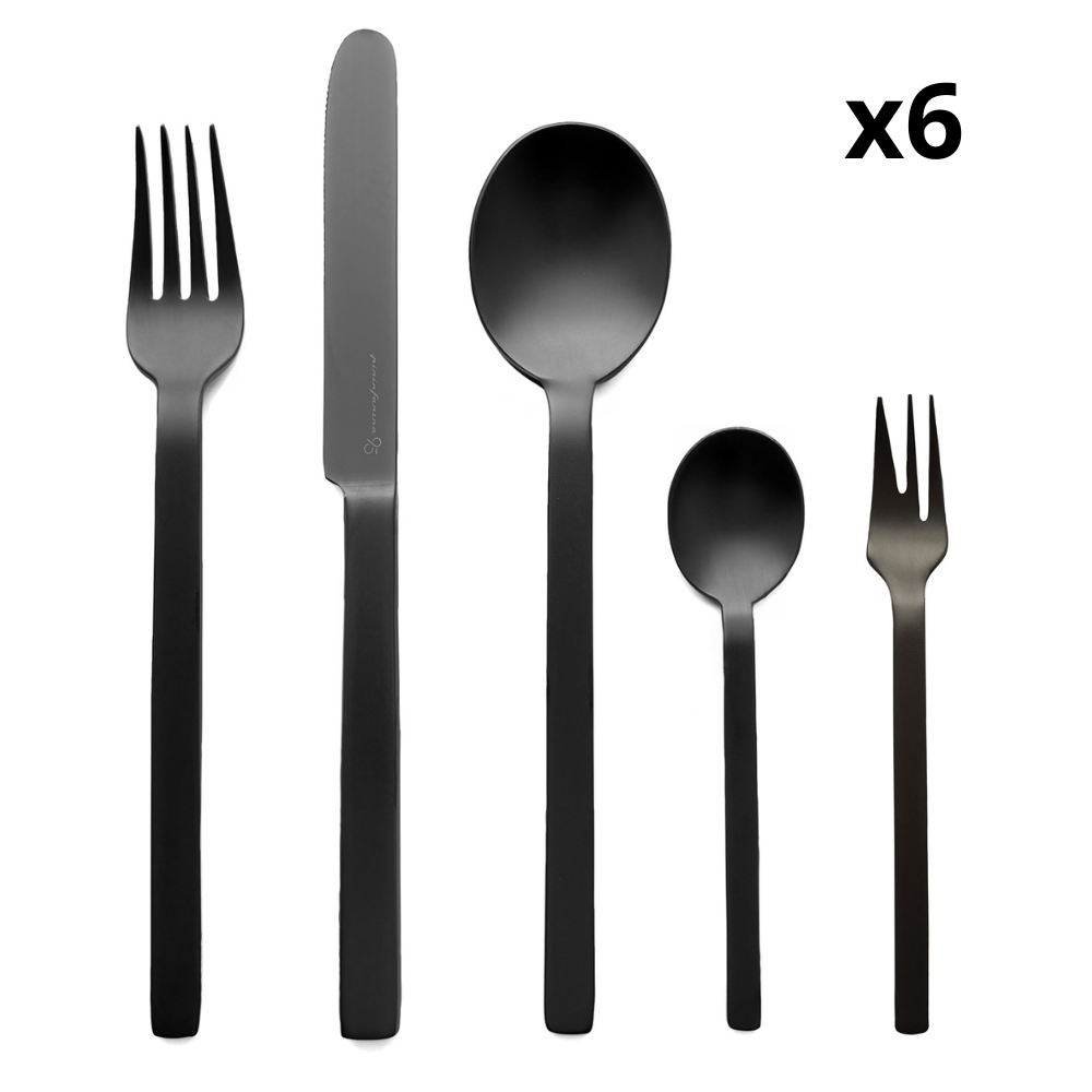 Il set comprende i ventiquattro elementi essenziali per una tavola completa: sei forchette da tavola, sei coltelli da tavola, sei cucchiai da tavola, sei cucchiaini da caffè e sei forchettine da torta. Ogni pezzo unisce ergonomia e bellezza, con finiture raffinate che donano armonia ed eleganza ad ogni servizio.