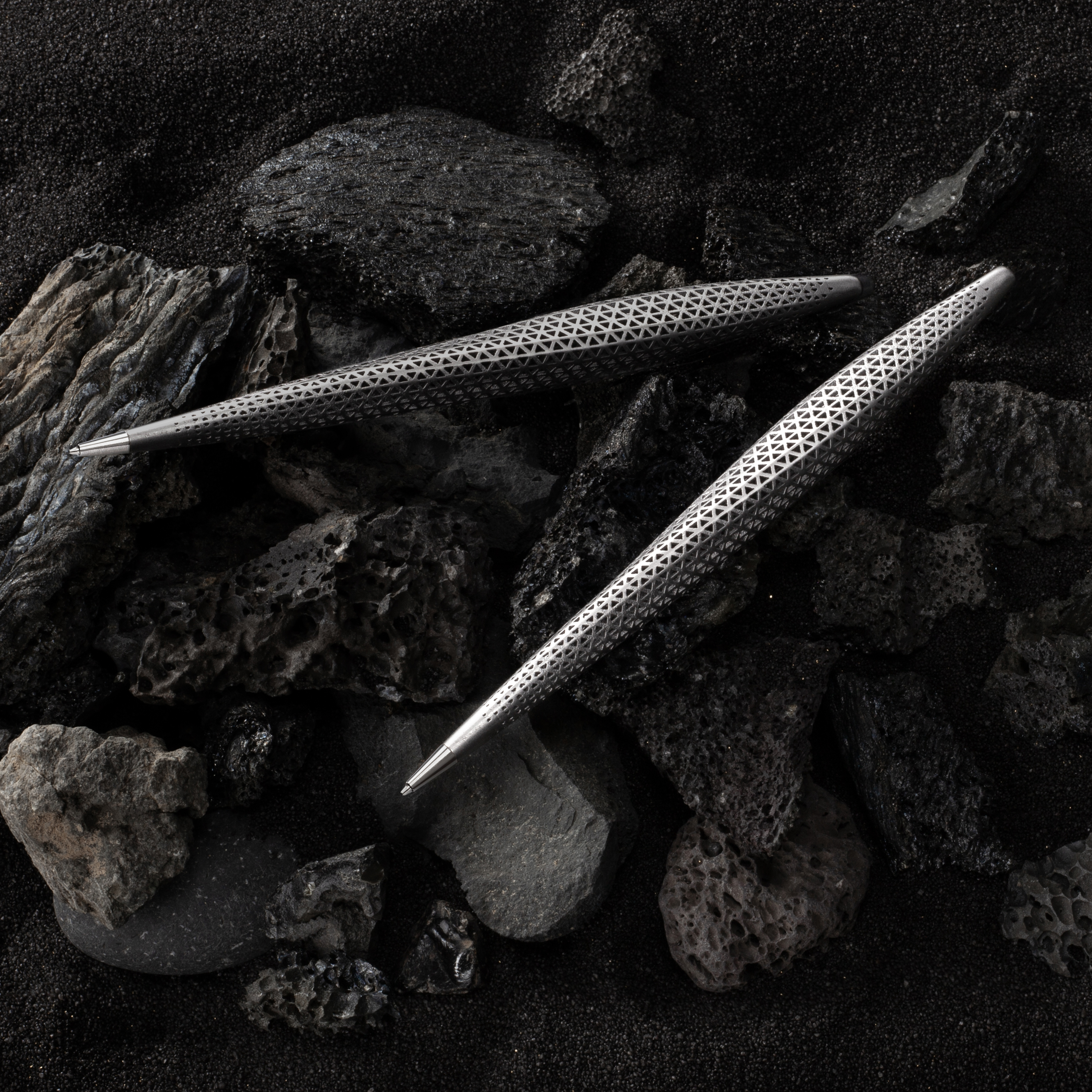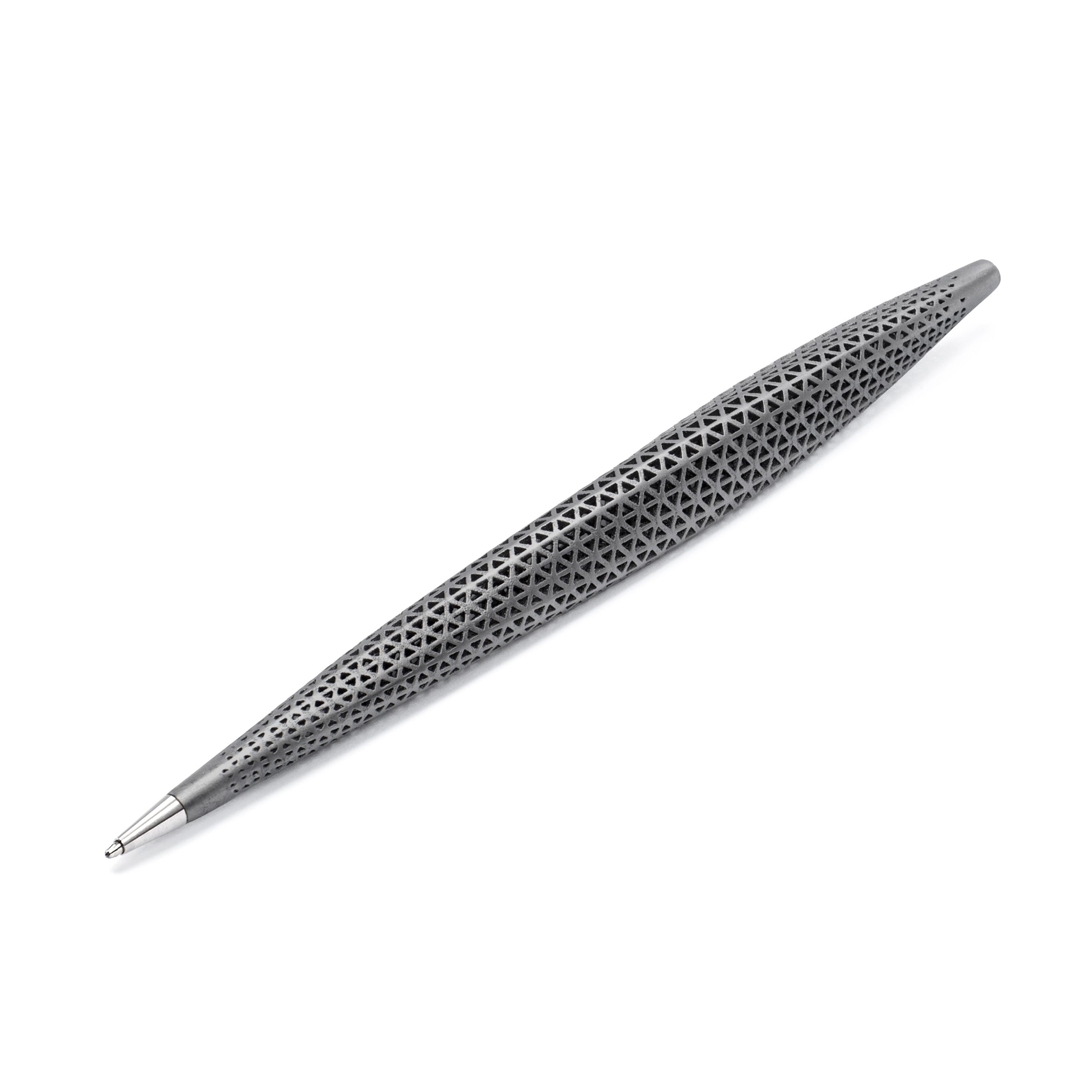 La sezione triangolare, generata dai tre assi teorici in torsione, è studiata per migliorare l’ergonomia e la stabilità dell’impugnatura durante la scrittura prolungata. La traforatura non è solo un segno estetico, ma un elemento funzionale che riduce il peso e migliora l’efficienza strutturale del prodotto.